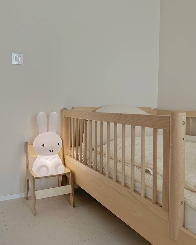몸부림이 심한 아이라 가드있는 튼튼한 원목침대와 귀여운 토끼 수면등이 함께자리잡고있답니다 :)