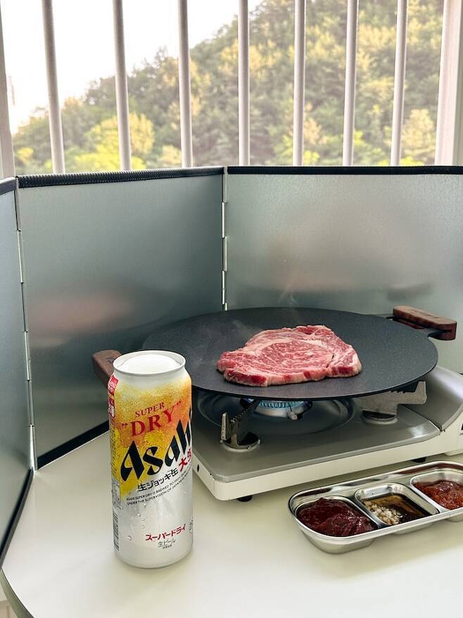 캠핑 테이블이 오기 전 이렇게라도 즐기는 베란다 캠핑 놀이에요 ㅋㅋ 집 안에서 고기 구워 먹는 건 상상도 못했던 성격인데,, 베란다가 있으니 너무 좋더라구요.