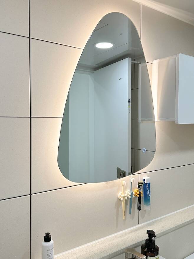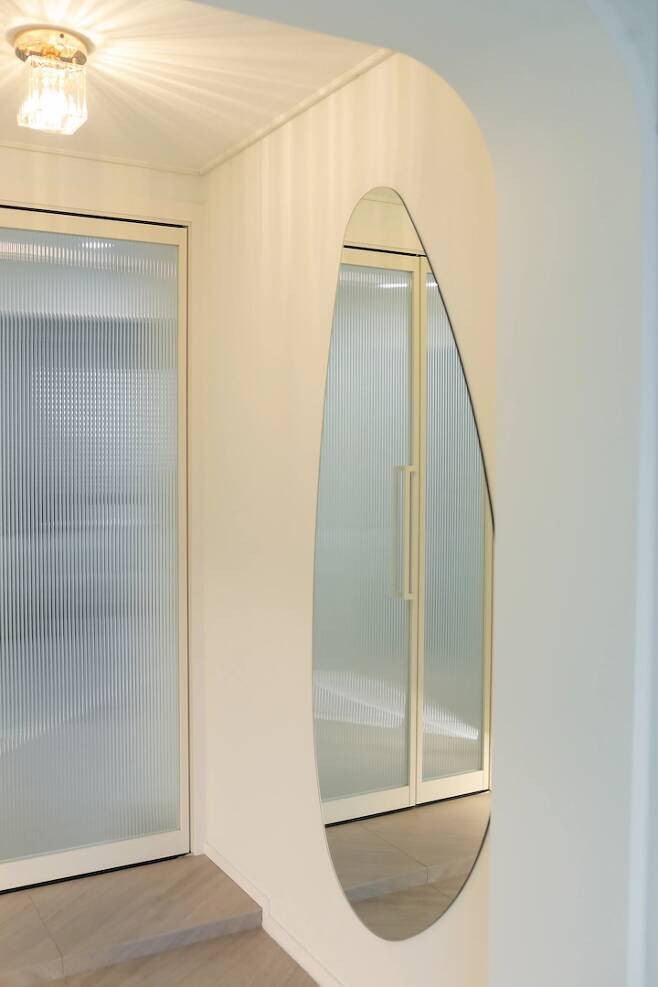 신발장 밑 부분은 띄움 시공을 해 자주 신는 신발들을 정리하기 좋게 해두었고 신발장 맞은편으론 비정형 전신 거울을 설치했어요. 우리 6세 여자애 포토존입니다ㅎㅎ