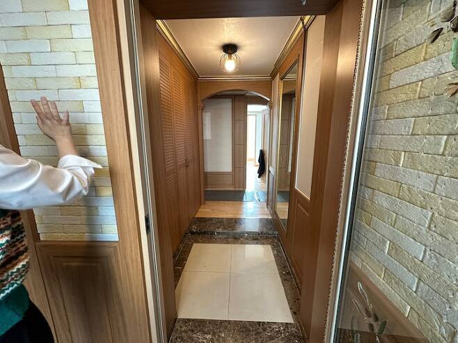 몰딩이 어마 무시하게 많았던 우리집 (저 무시무시한 체리 몰딩이 온 집을 휘감고 있었죠... 철거도 일반 가정집보다 2-3배는 많이 나왔습니다ㅠㅠ) 그래도 ㄱ자 구조로 꺾여있는 넓은 현관임에 감사했어요.