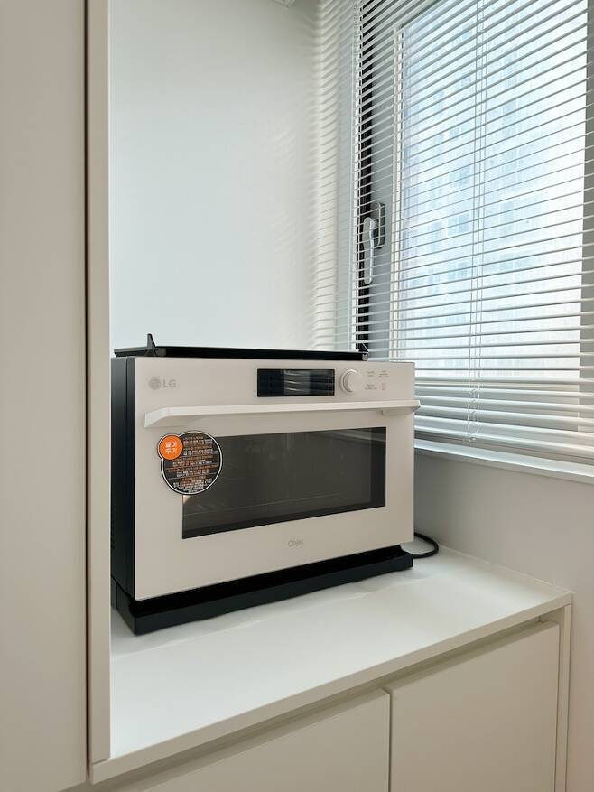 창문 앞엔 광파 오븐이 자리 잡고 있어요. 아끼느라 아직 기름 떨어지는 요리는 못 해봤지만요,, ㅋㅋㅋㅋㅋㅋ 이 자리도 오븐 올릴 거 계산해서 하프장으로 제작 요청드렸어요.
