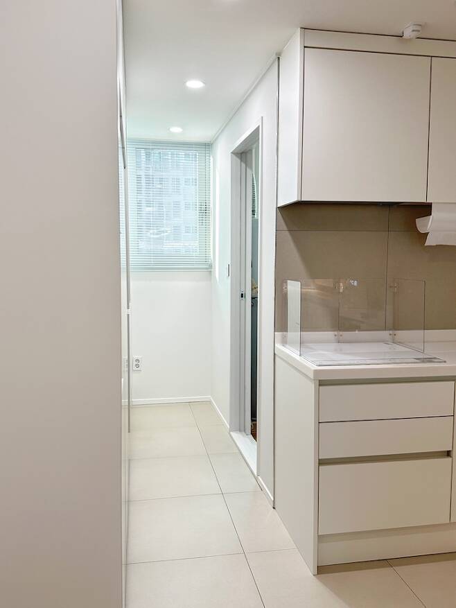 원랜 냉장고가 있던 뒤 베란다였던 곳을 확장해 주방으로 길게 연결했어요. 오른쪽엔 세탁실 겸 보일러실입니다. 문을 달아서 소음에도 불편함 없이 지내고 있어요.