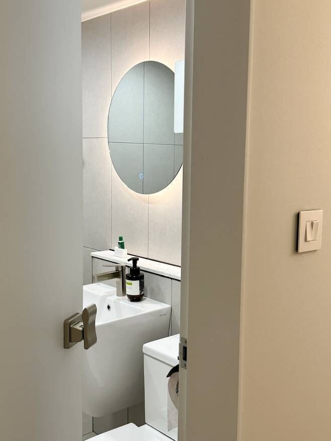 수전은 무광 수전으로 모두 통일했어요. 무광 수전은 물때 관리가 어렵다고들 하셨는데.. 저흰 원래 씻고 나면 몸 닦은 수건으로 수전까지 슥~닦고 스퀴지로 바닥 물기까지 제거하고 나오는 사람들이라 불편함 없이 잘 사용 중이에요 :)