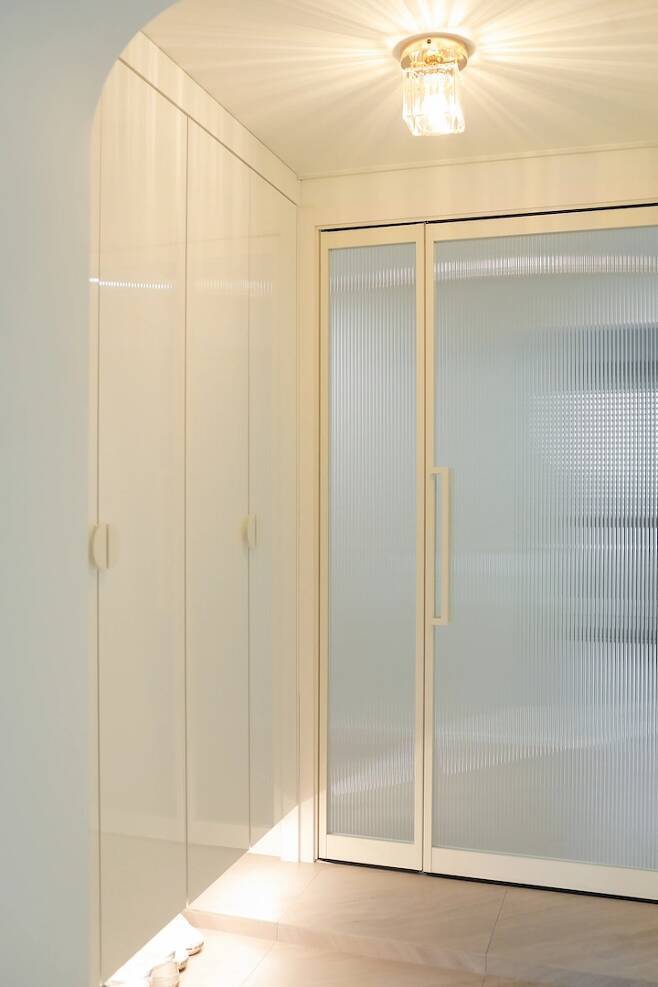 문, 신발장 모든 것이 화이트 화이트. 바닥재로 약간의 무게감을 더하니 더 안정적인 현관의 모습으로 변신했네요.