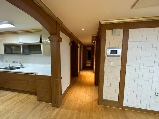 거실 쪽에서 바라본 복도 Before에요. 여기도 몰딩 지옥.. ㅠㅠ 주방을 지나 왼쪽에 중문 입구와 화장실이 위치하고 오른쪽엔 드레스룸과 복도 끝엔 아이방이 위치합니다.
