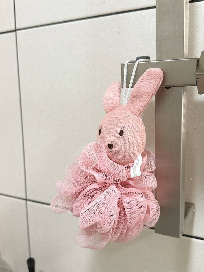 욕실에도 마찬가지로 최대한 깔끔하게 딱 필요한 것들만 꺼내두고 생활해요. 6세 여자아이의 귀여운 토끼 친구도 어쩔 수 없이(?) 함께 합니다..ㅋㅋ