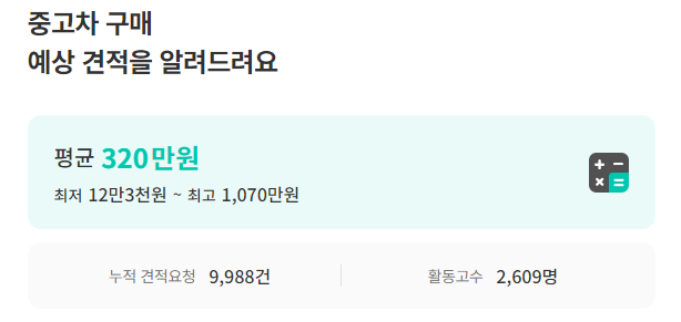 숨고 내에서 거래되는 중고차 구매 평균 비용은 건당 320만 원입니다. 최저 비용은 12만 3천 원, 최고 비용은 1,070만 원으로 책정되어 있어요.