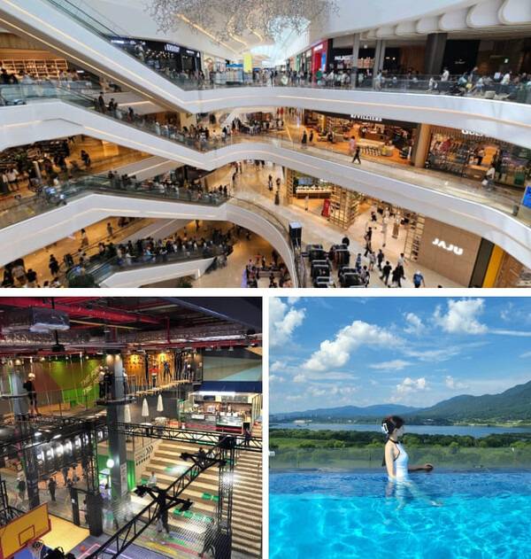 3층에 있는 아쿠아필드 하남에서는 비 오는 날 즐기기 좋은 찜질스파뿐만 아니라 워터파크도 준비되어 있어 여름을 즐기기 매우 좋습니다. 특히 옥상에는 팔당댐을 배경으로 수영을 즐길 수 있는 인피니티 풀도 마련되어 있으니, 이곳에서 여름을 만끽해 보시기 바랍니다.