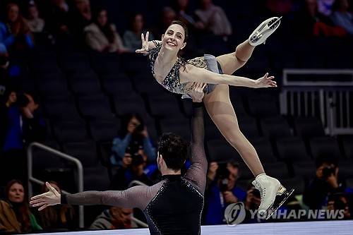 epa11990973 Deanna Stellato-Dudek and Maxime Deschamps of Canada perform during the Pairs Short Program during the ISU Figure Skating World Championships in Boston, Massachusetts, USA, 26 March 2025. EPA/CJ GUNTHER