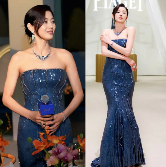 전지현이 또한번 독보적인 존재감이 빛났습니다. 늘 압도적인 분위기와 완벽한 실루엣으로 시선을 사로잡는 그녀가 이번엔 블루 컬러의 시퀀 탑드레스를 선택해, 마치 인어공주를 연상케 하는 환상적인 룩을 선보였어요.