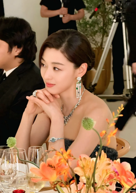 드레스가 충분히 강렬한 존재감을 주는 만큼, 주얼리 선택도 놓치지 않았습니다. 전지현은 큼직한 귀걸이와 팔찌, 목걸이, 반지까지 블루와 실버가 믹스된 듯한 반짝이는 주얼리들을 매치해, 룩의 화려함을 극대화했어요.