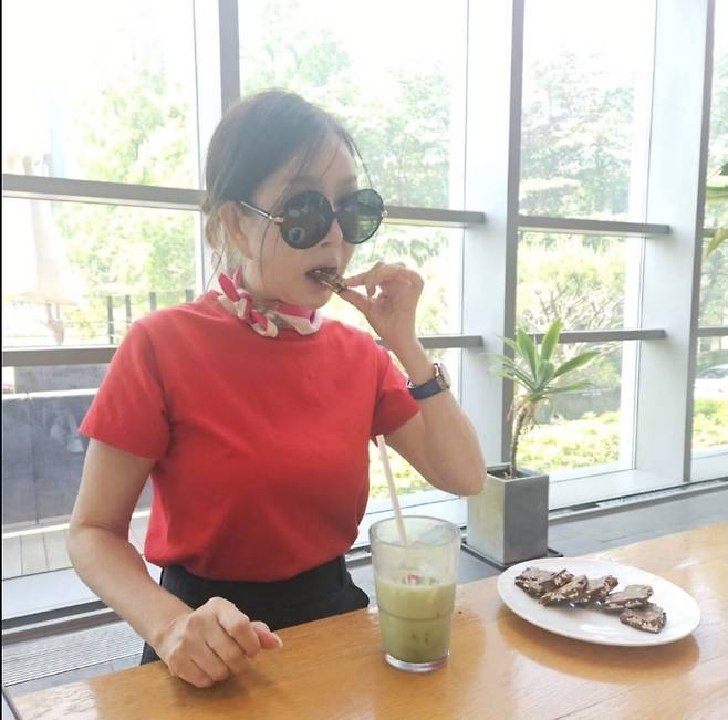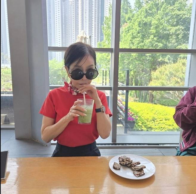 박준금은 강렬한 레드 컬러의 반팔 티셔츠에 핑크 패턴 스카프를 매치해 세련된 포인트를 줬습니다.