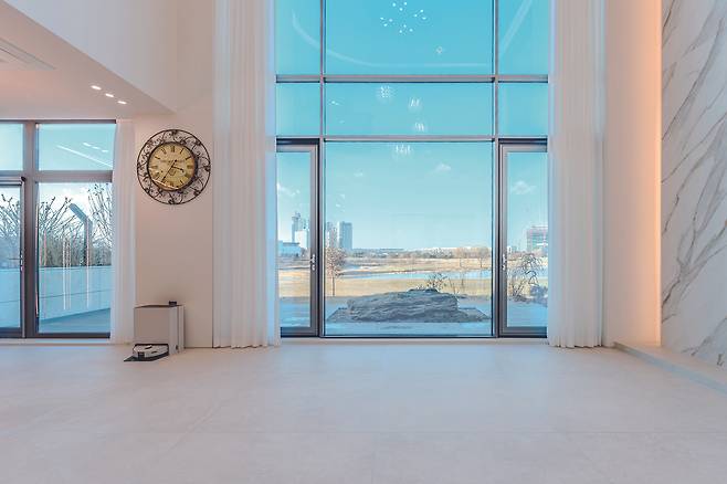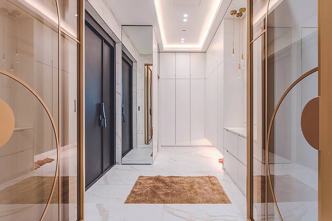 중문에서 이어지는 천장 높이에 변화를 줬다. 전면 가구를 배치해 개방감과 고급스러움으로 실내의 첫인상을 완성했다.