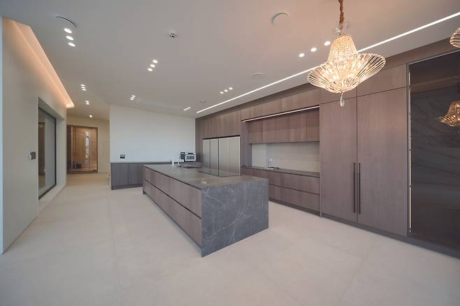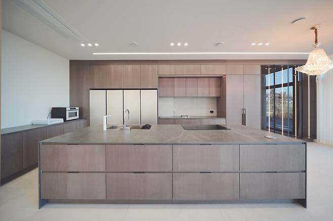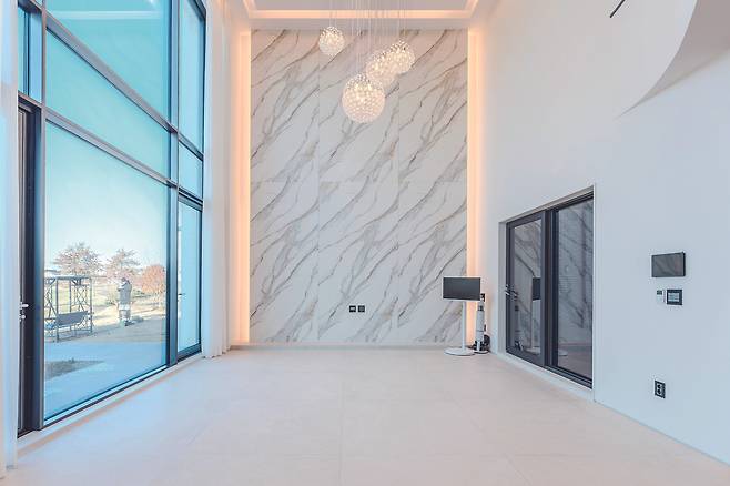 천장을 라운드 형태로 처리해 주방에서 이어지는 흐름과 조화를 이뤘다. 박판타일로 마감한 아트월은 그 자체로 거대한 매스감이 돋보인다.