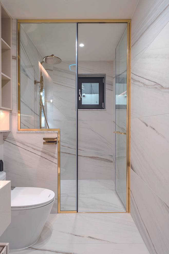 부드러운 골드비앙코 타일을 적용해 세련미를 더하고 금속으로 제작한 중문을 설치해 고급스러움을 더했다.