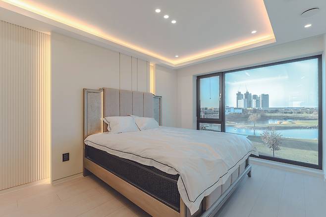헤드월 한 쪽을 박판타일을 적용해 포인트를 줬다. 천장을 라운드 형태로 디자인해 부드럽고 안락한 분위기로 연출했다.