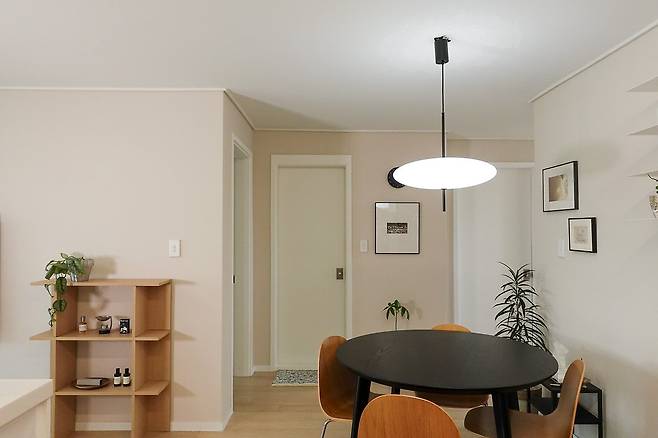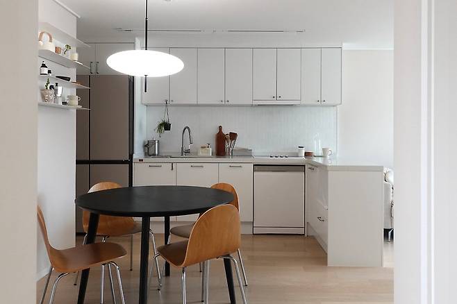 저희 집의 컨셉이 가장 잘 보이는 곳은 주방이라고 생각해요. 원래는 우드&블랙 컨셉으로 원래 흰색 테이블을 사용하다가 집이 전체적으로 밝은 것 같아 최근에 블랙 테이블과 그에 어울리는 조명을 달아줬습니다. 중앙에서 무게감을 잡아주면서도 따뜻한 분위기가 연출되는 것 같아 마음에 들어요.
