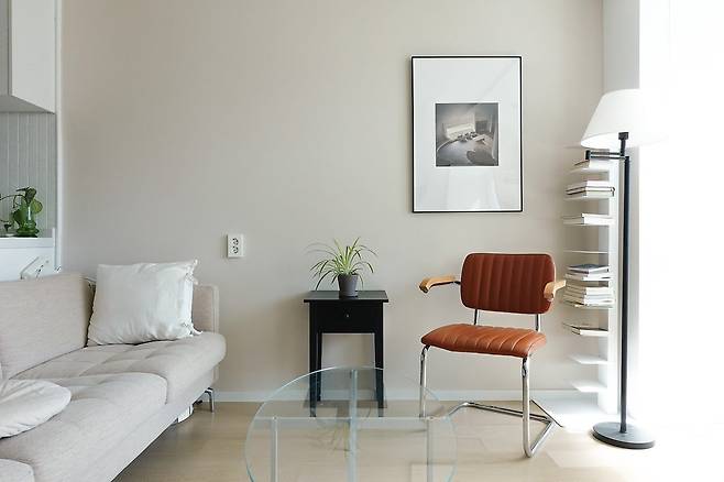 거실은 오래 보아도 질리지 않고, 깔끔하면서도 따뜻한 분위기가 되길 바랐어요. 그래서 내추럴한 컬러감에 밋밋하지 않게 우드, 스틸, 유리 등 소재를 믹스해 주었습니다. 여기에 블랙 포인트를 주어 지금의 모습을 완성했어요.