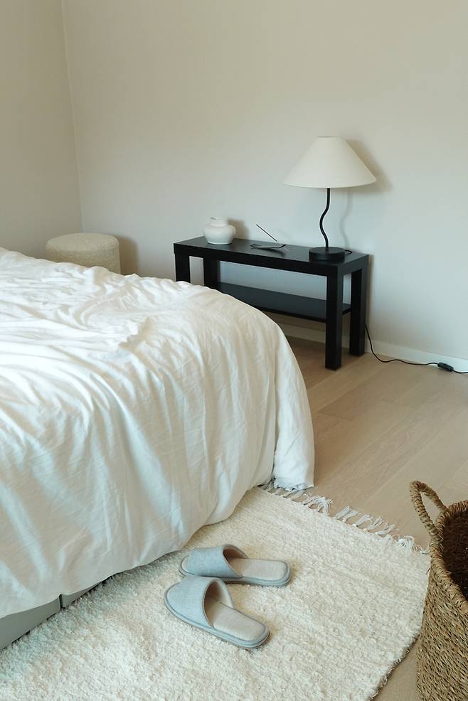 침실의 컨셉은 온전히 휴식을 취할 수 있는 공간이었어요. 사용하고 있는 침대 프레임은 시몬스의 Rowl 제품인데요. 헤드가 없는 제품을 원했는데 셀러님께서 Rowl 모델에서 헤드를 떼고 사용하는 걸 추천해 주셔서 아주 잘 쓰고 있어요. 침대 프레임 아래로 먼지 쌓일 걱정도 없어서 좋은 것 같아요.