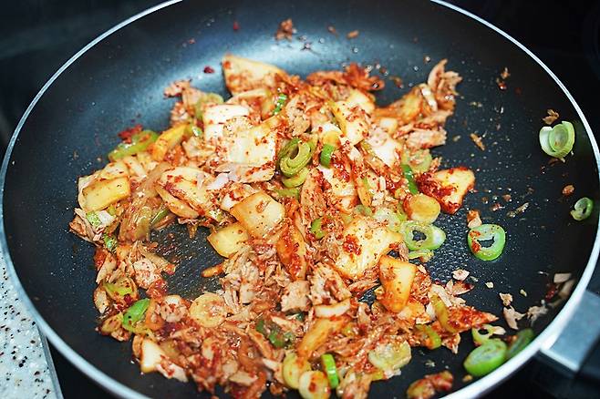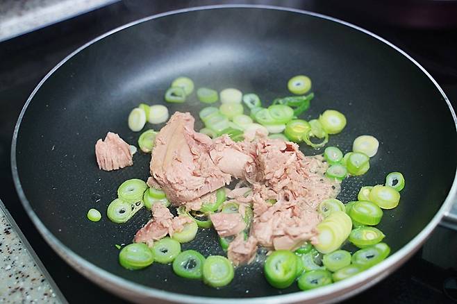 어느 정도 파향이 나면 참치를 넣어준 후 볶아주세요!