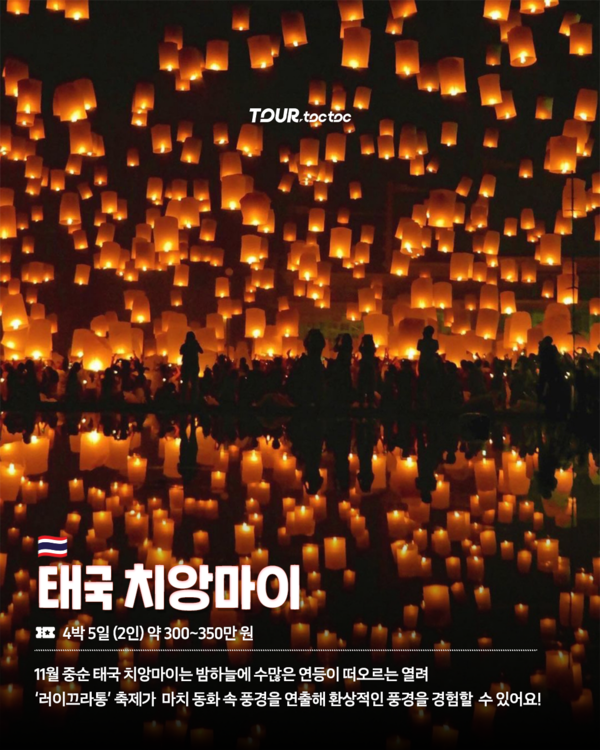 11월 중순 태국 치앙마이는 밤하늘에 수많은 연등이 떠오르는 ‘러이끄라통(Loy Krathong)’ 축제가 열려 마치 동화 속 풍경을 연출합니다.