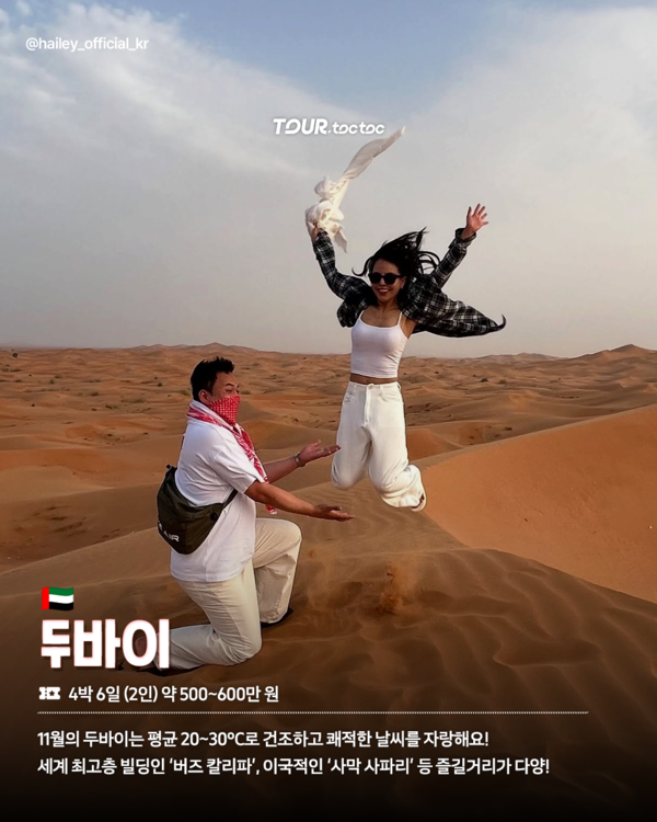 또 연말 시즌을 앞두고 두바이 쇼핑 페스티벌이 들어가는 시점으로, 대형 쇼핑몰에서 다양한 세일을 즐길 수 있어 11월 추천드리는 해외여행지입니다
