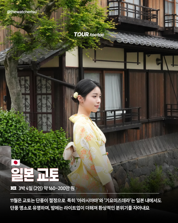 11월은 교토 단풍의 절정인 시기입니다. 특히 일본의 옛 수도 였던 교토에서는 사찰과 전통 거리가 어우러진 고즈넉한 분위기 속에서 붉게 물든 단풍을 감상할 수 있습니다.