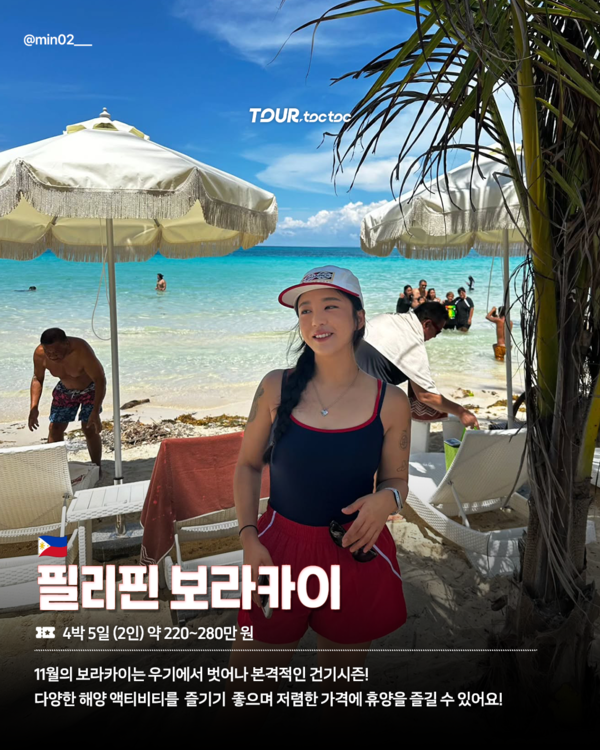 11월의 보라카이는 우기에서 벗어나 본격적인 건기로 진입해 해양 액티비티를 즐기기 가장 좋은 시기입니다.
