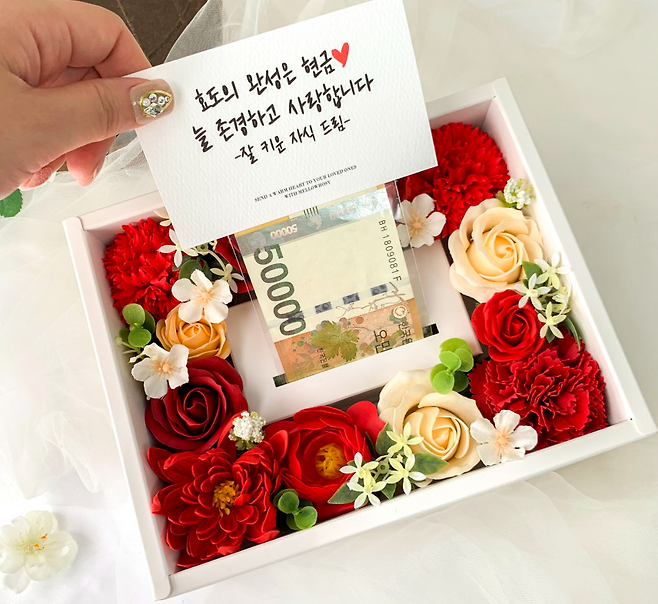 비누 꽃과 엽서 카드로 구성된 용돈 박스. 카드를 꺼내기 위해 살짝 당기는 순간, 감춰져 있던 지폐가 한장씩 이어져 흘러나온다. 단정한 꽃 상자 속에서 길게 펼쳐지는 지폐는 예상치 못한 즐거움을 선사한다. 따뜻한 메시지와 함께 건네는 이 유쾌한 반전은 부모님의 얼굴에 함박웃음을 불러오기에 충분하다.