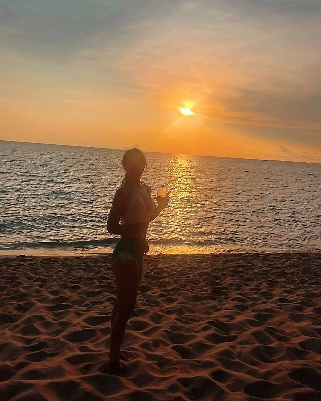 햇살이 쏟아지는 선베드 위에서 그녀는 민소매 비키니 위에 타월을 깔고 자연스럽게 누워 여유로운 분위기를 연출했다. 손에는 시원한 민트 칵테일을 든 채, 꾸미지 않은 듯한 내추럴한 셀카 포즈는 휴양지의 낭만을 고스란히 담아냈다. 별다른 액세서리 없이도 피부톤과 잘 어우러진 컬러 매치와 건강미 넘치는 스타일이 시선을 사로잡는다.