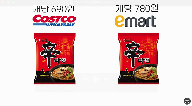 코스트코의 인기 비결 중 하나는 대형마트보다 저렴한 가격이다. 코스트코 코리아의 신라면 가격은 개당 690원(30개 2만790원), 이마트는 개당 780원이다.