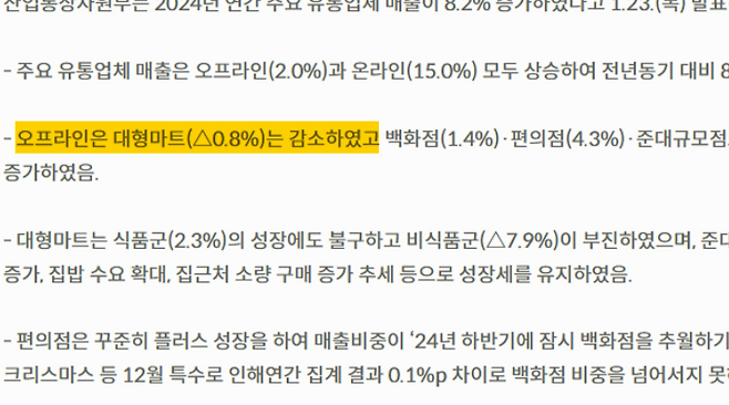 산업통상자원부의 ‘2024년 연간 주요 유통업체 매출’에 따르면 지난해 대형마트 매출은 전년 대비(2023년) 0.8% 감소했다. 백화점, 편의점 등은 모두 매출이 늘었지만, 대형마트만 매출이 줄었다.특히 이마트는 지난해 199억 원의 영업손실을 기록했다.