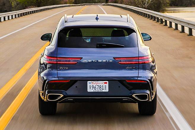 GV70의 핵심 개선점은 바로 승차감과 핸들링이다. 기존 전륜에만 적용되던 하이드로 부싱이 후륜까지 확대돼 충격 흡수력이 개선되었고, 스티어링 튜닝을 통해 코너링 안정성도 한층 강화됐다. 또한 고속도로 바디 모션 제어(HBC) 기능이 추가된 프리뷰 전자제어 서스펜션은 스마트 크루즈 컨트롤 사용 시 차량의 움직임을 정밀하게 제어해 고속 주행에서의 안정감과 승차감을 향상시켰다. 모터트렌드와 카앤드라이버는 GV70의 핸들링과 승차감을 “이전보다 확실히 개선됐다”고 호평했다.