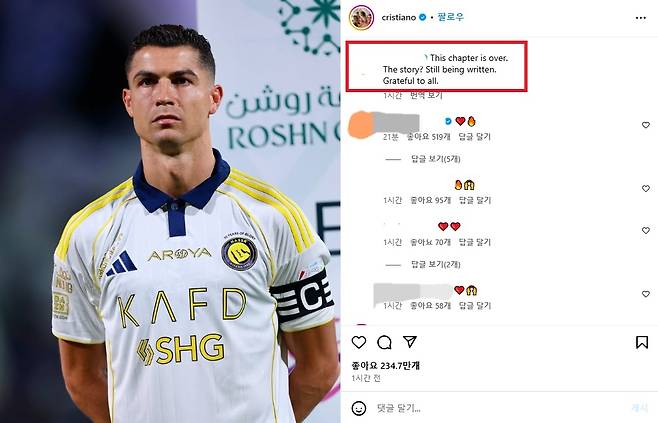 경기 종료 후 호날두가 알 나스르 이탈을 예고하는 게시물을 올리며 논란은 더욱 가중됐다. 그는 자신의 SNS를 통해 "이 장은 끝났다. 이야기? 아직 쓰이고 있다. 모든 이들에게 감사한다"며 이별을 암시했다.