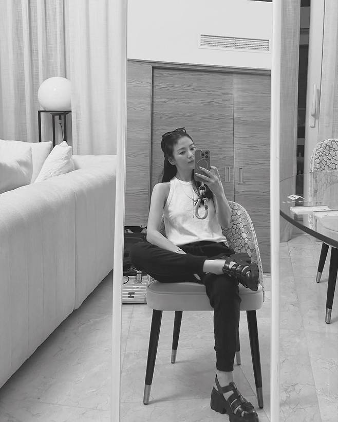 그녀의 SNS에서 공개된 사진 속에서 송혜교는 이국적인 인테리어가 돋보이는 공간에서 슬림한 민소매 티셔츠에 캐주얼한 팬츠를 매치, 자연스러운 스타일링에도 특유의 분위기를 완성해냈다.