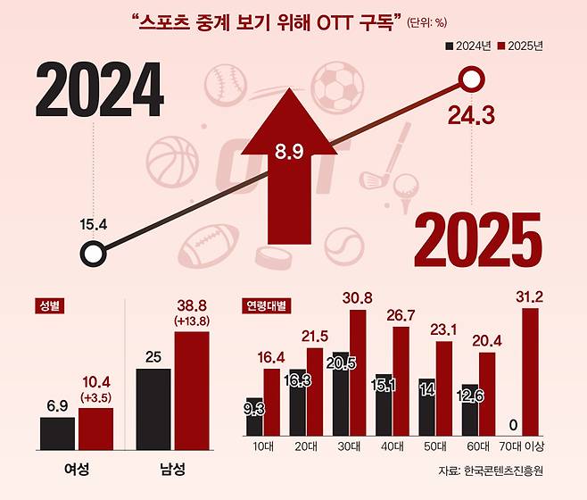 시청 패턴의 구조적 변화를 보더라도 OTT가 스포츠를 잡는 이유는 명확해진다. 스포츠 중계를 보기 위해 OTT를 구독하는 이용자의 비중은 2024년 15.4%에서 2025년 24.3%로 높아졌다. 특히 남성은 13.8%포인트 불어난 38.8%를 나타냈고, 여성 역시 6.9%에서 10.4%로 상승했다. 주목할 점은 전 연령대에서의 확산세다. 핵심 시청층인 3040 세대뿐 아니라 5060 세대(20%대), 70세 이상(31.2%)에서도 높은 수치가 나타나는 등 스포츠 시청을 위한 유료 구독이 보편적 미디어 소비 행태로 자리 잡은 것이다. 김인애 한국콘텐츠진흥원 콘텐츠산업정책연구센터 책임연구원은 "KBO 등 국내 프로 스포츠의 인기 상승 흐름에 주목할 필요가 있다"며 "프로 스포츠 중계 콘텐츠는 국내 OTT 플랫폼이 충성도 높은 이용자를 확보하고 수익 구조를 개선할 수 있는 기회가 될 것으로 예상된다"고 짚었다.