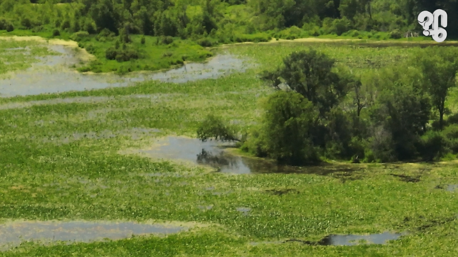이 사진을 보라. 수면을 가득 덮은 이 식물들의 정체는 부레옥잠.
