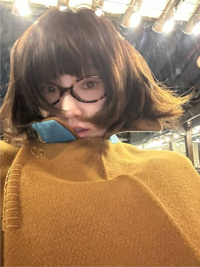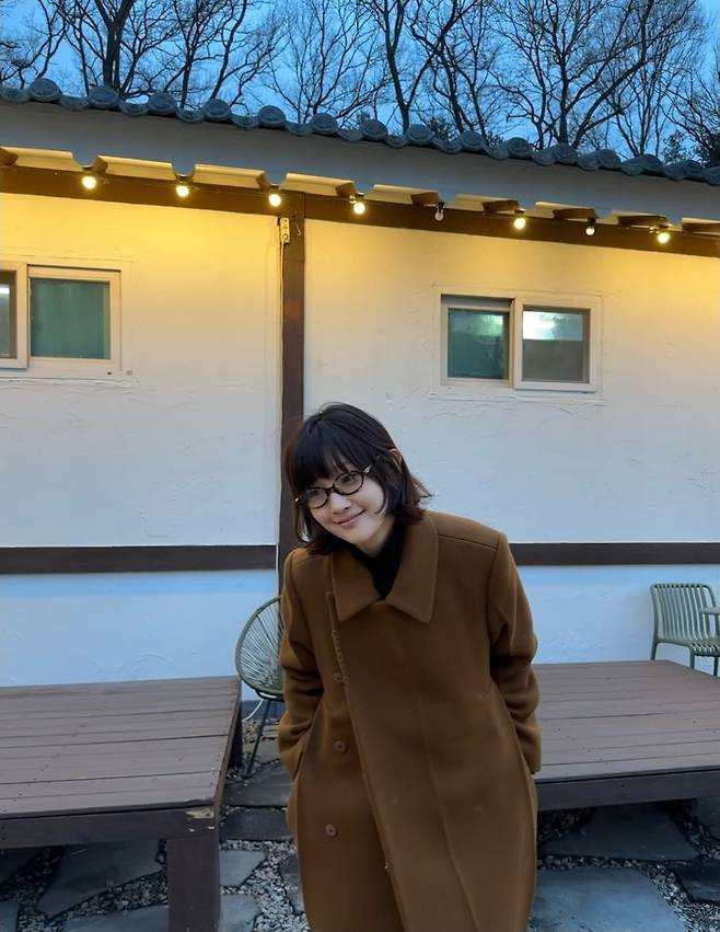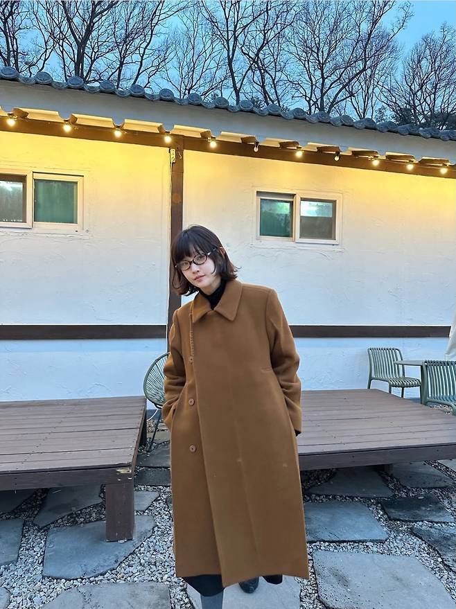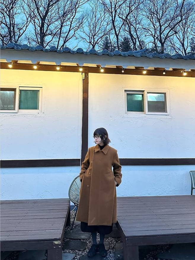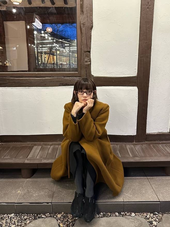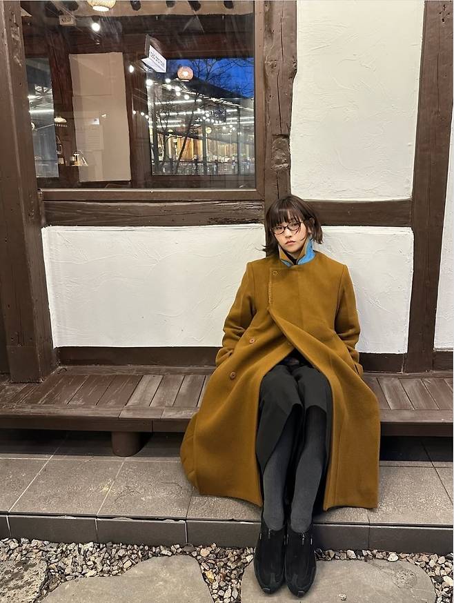 여기에 둥근 뿔테 안경과 자연스러운 단발 헤어를 더해 지적인 무드를 강조했으며, 따뜻한 조명이 비치는 한옥풍 공간과 어우러져 감성적인 분위기를 배가시켰다.