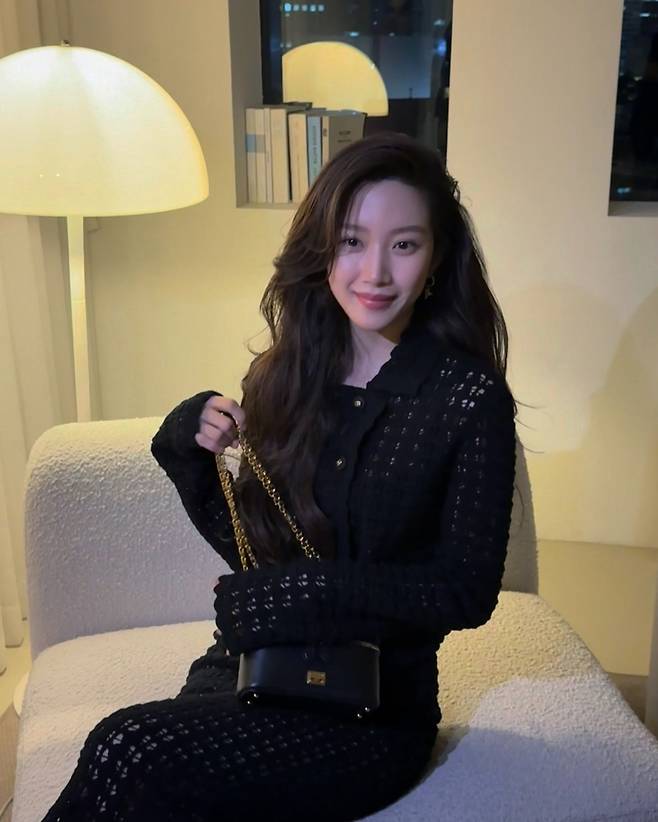 검은색 니트 원피스를 착용한 문가영은 세련된 모노톤 룩을 완성했다. 체인 스트랩 백과 웨이브 헤어로 포인트를 주어 시크하면서도 여성스러운 매력을 발산하고 있다.