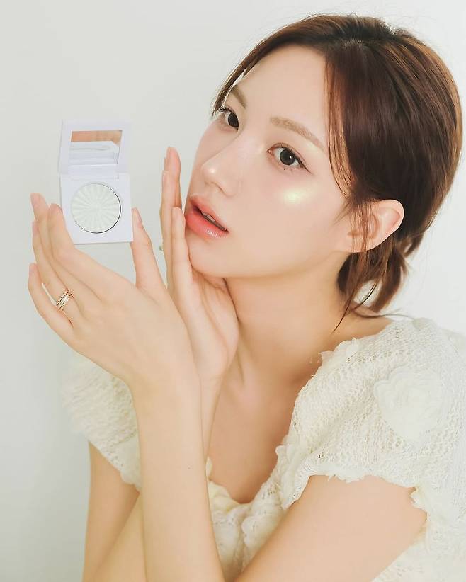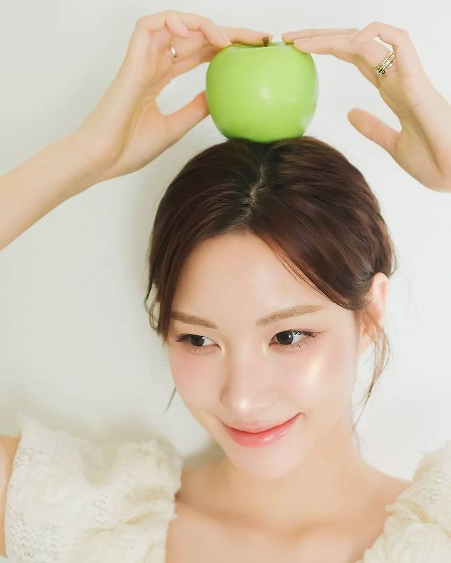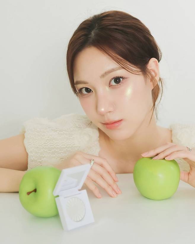 스타일링 또한 메이크업을 한층 돋보이게 한다. 아이보리 레이스 디테일의 상의는 로맨틱하면서도 여성스러운 무드를 자아내며, 얼굴을 더욱 환하게 밝혀준다. 헤어는 깔끔하게 정돈한 업스타일로 청초한 이미지를 강조했으며, 여기에 더해진 사과 소품은 이번 메이크업 콘셉트를 직관적으로 보여주는 사랑스러운 포인트로 작용한다.