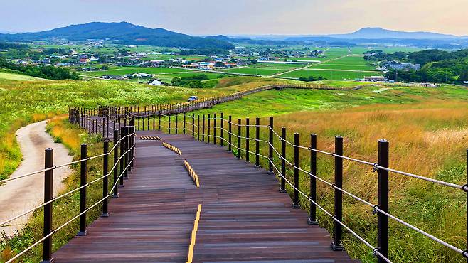 해발 약 200m 구릉 지형 위에 조성된 길은 걷는 내내 시야가 탁 트여 있다. 단순한 숲길이 아니라, 넓게 펼쳐진 초지와 부드러운 능선이 어우러지며 이국적인 풍경을 만들어낸다.