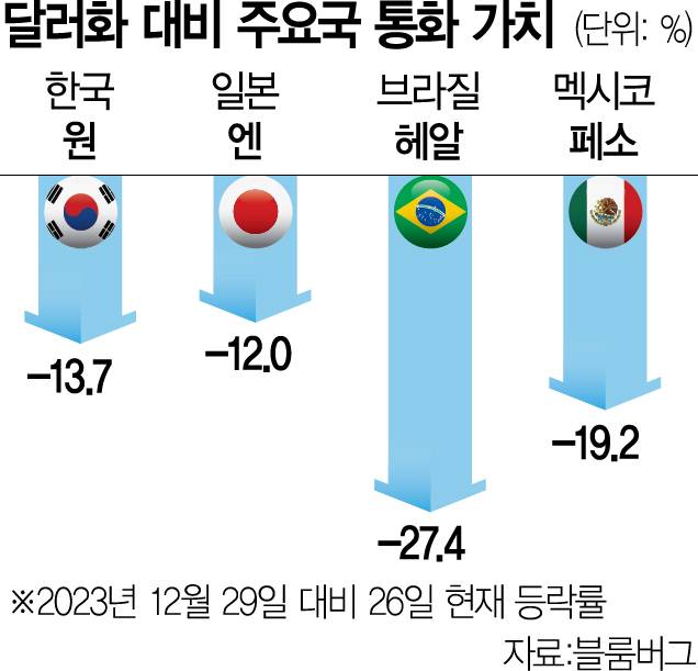 미국 달러 강세와 높은 국채 수익률에 일본 엔화와 신흥국 통화가 압박을 받고 있다. 달러 대비 엔화 가치는 5개월 만에 낮은 수준으로 내려앉았고 브라질 헤알화 가치는 올해 들어 30% 가까이 떨어졌다. 자국 내 경제·정치적 요인에 더해 차기 미국 행정부 출범에 따른 불확실성까지 겹쳐 주요국 통화 약세가 가속화하고 있다는 분석이다.