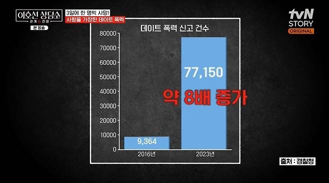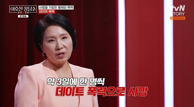이호선은 데이트 폭력 발생 빈도에 관해 "약 3일에 한 명씩 데이트 폭력으로 사망한다. 현재 통계로 보자면, 2023년에 데이트 폭력 신고 건수가 77,150건. 10년 사이 약 8배가 증가했다"라며 "데이트 빈도가 늘어서 폭력이 발생하느냐. 그건 아니다. 오히려 인구는 줄었다"라면서 그만큼 데이트 폭력이 빈번하게 발생하는 거라고 밝혔다.
