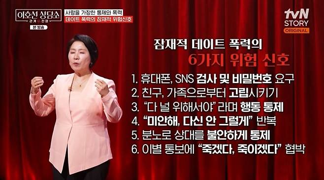 이호선은 잠재적 데이트 폭력의 6가지의 위험 신호를 밝혔다. 이호선은 "휴대폰, SNS 검사 및 비밀번호 요구하거나, 친구, 가족으로부터 고립시킨다. '다 널 위해서야'라며 행동을 통제하기 시작한다. 때리고 '미안해, 다신 안 그럴게' 이런 일이 반복된다. 분노로 상대를 불안하게 통제하고, 이별 통보에 '죽겠다, 죽이겠다' 협박한다"라며 하나라도 해당 시 정말 조심해야 한다고 당부했다.