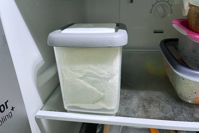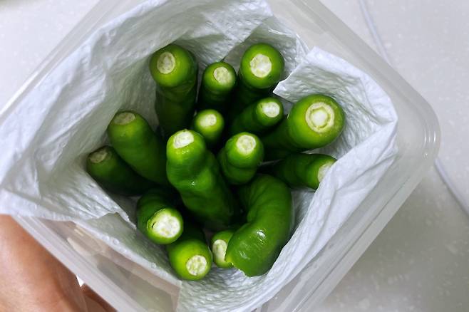 청양고추를 보관할 밀폐용기에 키친타월을 깔아주세요. 이 키친타월이 습기를 제거해 줘서 물러짐 방지에 도움이 됩니다.