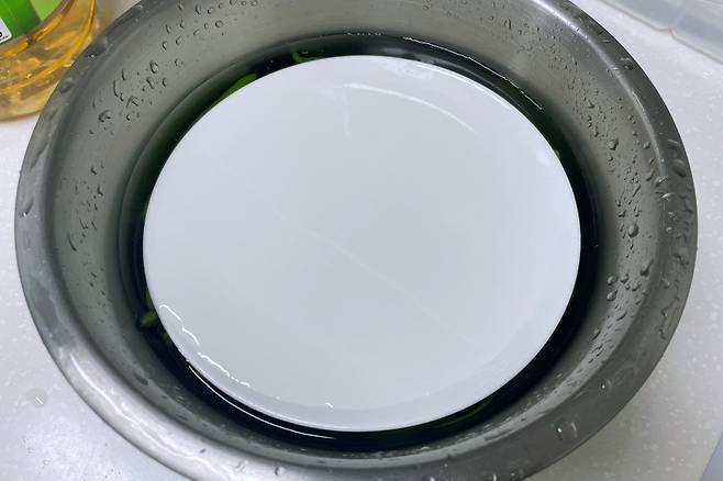 고추가 위로 둥둥 뜬다면 접시로 눌러 주시면 됩니다.