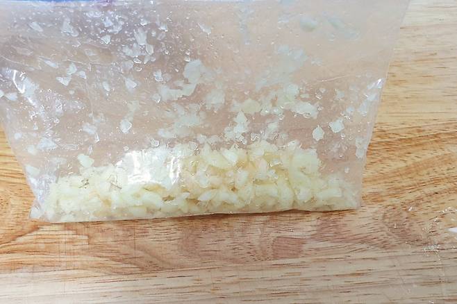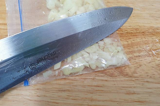 이럴 때 마늘을 칼로 작게 썰어 지퍼백에 넣어주시고요. 칼날등으로 다져주시면 하나도 튀지 않으면서 정말 잘 다져집니다.