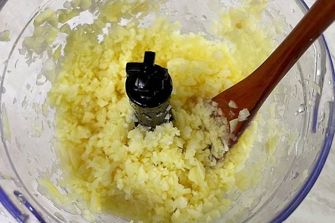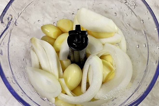 바로 양파를 약간 넣어주시는 건데요. 비율은 마늘 9: 양파 1의 비율로 넣어 갈아주시면 된답니다.