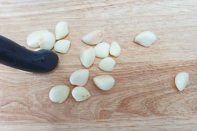많은 양의 다진 마늘은 믹서기로 갈지만 적은 양의 마늘을 다질 때는 칼등으로 다져주는데요. 칼등으로 그냥 다졌더니 마늘이 이리저리 튀더라고요