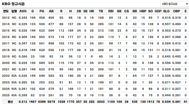 2025년은 나성범에게 지우고 싶은 해였을 것이다. 종아리 부상 여파로 82경기에 나서는 데 그쳤고, 성적표는 더욱 초라했다.